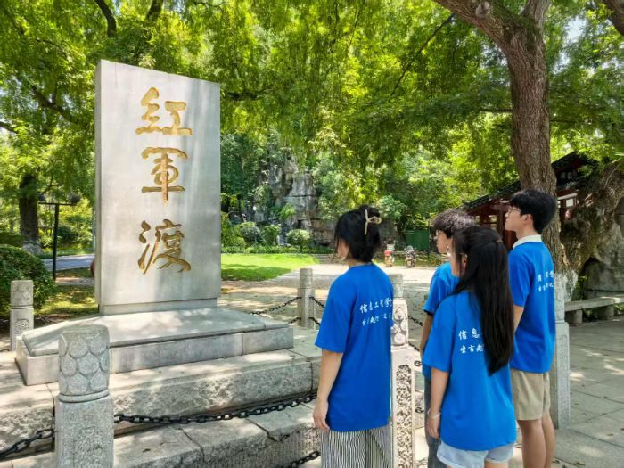 (圖為館內陳列革命英烈事跡。通訊員周毓哲攝) 當日下午,實踐隊來到紅軍渡廣場。古銀杏樹下,紅軍渡石碑前,全體團員身戴團徽,莊嚴肅立,表達積極向黨組織靠攏和為共產主義事業奮斗終身的堅定決心。通過重走紅軍在湖跡渡的革命足跡,全體隊員感悟到革命先輩們為了民族解放事業,不惜拋頭顱、灑熱血的堅定信念和偉大精神。