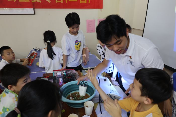 7月7日,正值臺(tái)風(fēng)帶來(lái)強(qiáng)降水,《氣候行動(dòng)先鋒》課程率先開(kāi)課。課堂上,孩子們?cè)谟^(guān)察志愿者用一次性水杯模擬山體滑坡演示實(shí)驗(yàn)后自己動(dòng)手操作,在直觀(guān)體驗(yàn)中探究自然變化規(guī)律。這一幕讓志愿者們深切感悟到教育的意義正是在孩子們心中種下責(zé)任的種子,引導(dǎo)他們關(guān)注氣候變化、樹(shù)立環(huán)保意識(shí)。