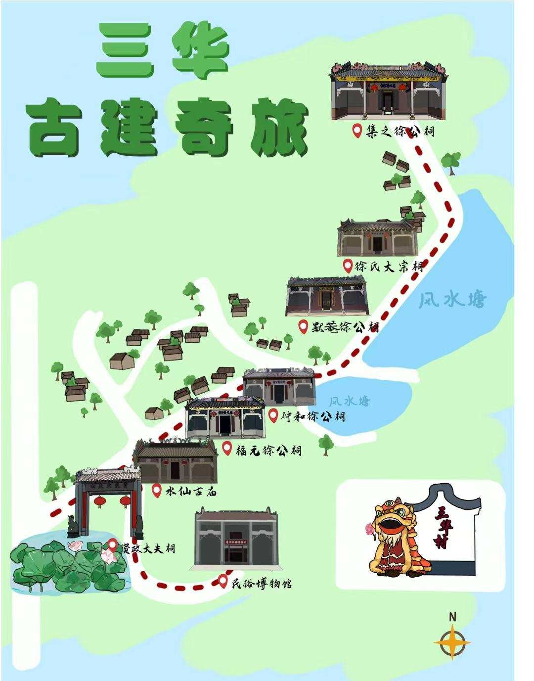 “三華村古建林立,祠堂眾多,但是村中主干道的標志性建筑還是比較明顯,我想以這個為出發點設計旅游打卡路線”,Young 實踐團文創組組長陳佳怡同學主動承擔起了這項手繪地圖的任務。從“民俗博物館-資政大夫祠-水仙古廟-福元徐公祠-仲和徐公祠-默庵徐公祠-徐氏大宗祠-集之徐公祠”這一空間路線的確定,到主題風格、色彩搭配等元素的選取,再到場館外景、標志特征、文字標注等元素的繪制,陳佳怡同學結合親身體驗、學習思考和實踐感悟,堅持原創性和真實性,最終為三華村繪制出了具有鮮明地域性、標志性和故事性的手繪地圖。