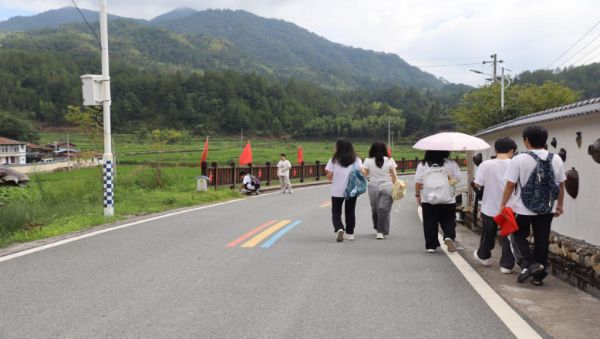 圖為實踐隊隊員在村中道路行走。葉靈鑫攝