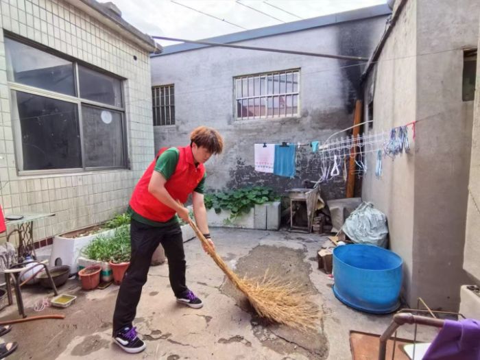 圖為團隊隊長韓林軒幫助獨居老人打掃衛生。張子航通訊員攝