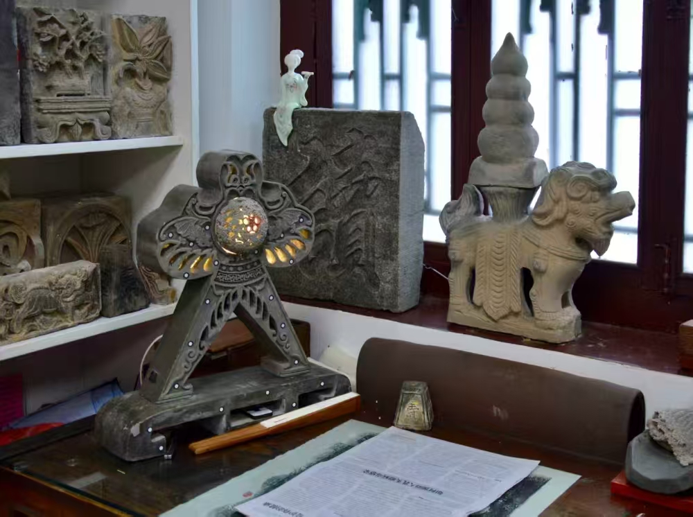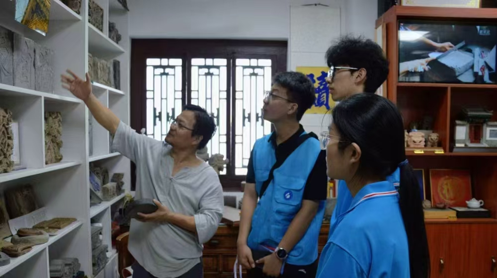隨后,團(tuán)隊(duì)拜訪了非遺傳承人神芳喬師傅。作為濰系磚雕第八代傳人,他堅(jiān)持 “實(shí)用與美觀相結(jié)合” 的理念,創(chuàng)作的《濰縣十景磚雕香薰系列》等作品屢獲國家及省市獎(jiǎng)項(xiàng),為磚雕傳承創(chuàng)新貢獻(xiàn)力量。在本次活動(dòng)中,神芳喬師傅談到,濰縣磚雕歷史悠久、工藝獨(dú)特:選用臨清磚或臨朐貢磚,古磚取自地下 70 公分黏土,富含礦物質(zhì),燒制后耐用,而現(xiàn)代磚易脆斷;運(yùn)用線雕、浮雕、鏤空等多種技法,其中鏤空和套環(huán)工藝難度極大,一件作品需半個(gè)月以上,精品耗時(shí)更久;與山西磚雕 “先泥塑后燒制” 不同,濰坊磚雕 “先燒后雕”,作品不易變形開裂。他還科普,老磚經(jīng)風(fēng)雨侵蝕形成的氧化鐵層呈自然青色,是判斷年代的依據(jù),如民國磚無明顯氧化層,清晚期與民國磚顏色有別,年代差距通常不超百年。同時(shí),他提及傳承困境 —— 學(xué)習(xí)的年輕人較少,讓隊(duì)員們深感非遺傳承的緊迫性。