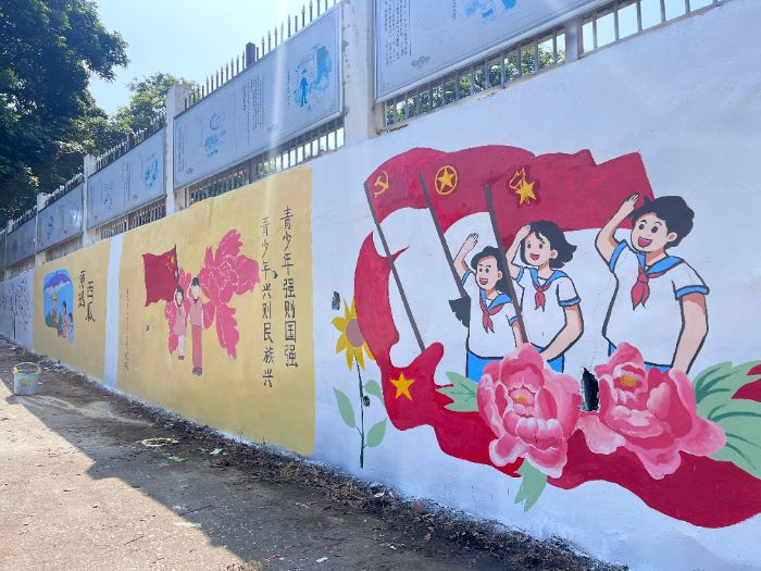 小學門口墻繪是價值觀培育的紅色陣地,核心直指“青少年強則國強,青少年新則民族新”。