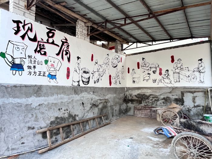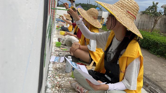 這組墻繪與去年創(chuàng)作的村落生活場景形成互文:去年以“南瑤豆腐制作”“鄉(xiāng)村鄰里情”“童年記憶”等為主題的墻繪,構成了村落的情感基底;今年新增的高鐵、校園、稻田主題,則搭建起發(fā)展維度,二者共同構成完整的文明檔案。隊員與村民的互動讓作品從“外來表達”變?yōu)?ldquo;在地生長”——種植戶校準色彩、農戶講述農耕故事,共同完成了文化主體的意義共建。