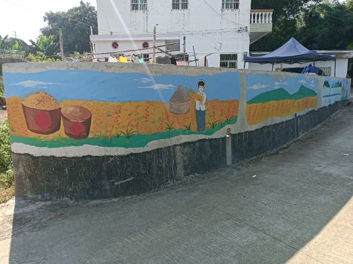農戶院墻的水稻創(chuàng)作,是農耕文明的微觀敘事。以季節(jié)為軸鋪展的畫面中,春季耕種的犁耙翻動紅壤、夏季生長的稻浪隨風起伏、秋季收割的鐮刀映亮谷穗,三個節(jié)點串聯起作物生長的生命韻律。