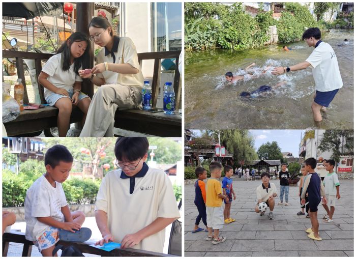 為促進村中各民族兒童相互了解,并創造運用普通話的實踐環境,下午實踐隊將活動重心轉向村里的孩子們,在村內組織了一場充滿歡聲笑語的文體活動。活動設置了游泳比賽、趣味足球和創意折紙等項目。游泳比賽中,孩子們在隊員們的安全看護下盡情戲水;足球場上,奔跑追逐的身影和加油吶喊聲交織成一片;折紙環節則激發了孩子們的創造力,他們用巧手折出各種有趣的造型。