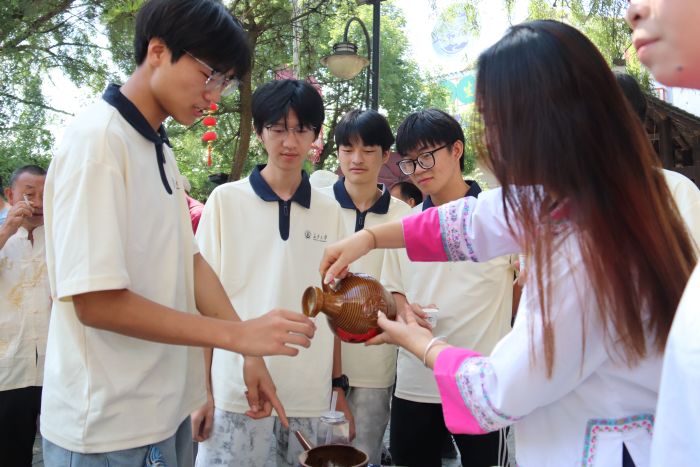 上午,實踐隊走至龍井村大門,恰逢布依族攔門酒儀式。攔門酒是布依族迎賓的最高禮節,蘊含著對賓客的誠摯歡迎與美好祝福。村民們身著民族服飾,手捧米酒,唱起悠揚的敬酒歌。隊員們依循當地習俗,親身體驗了這一飽含民族深情的獨特禮儀,深刻感受到布依族人民的熱情好客與開放包容。