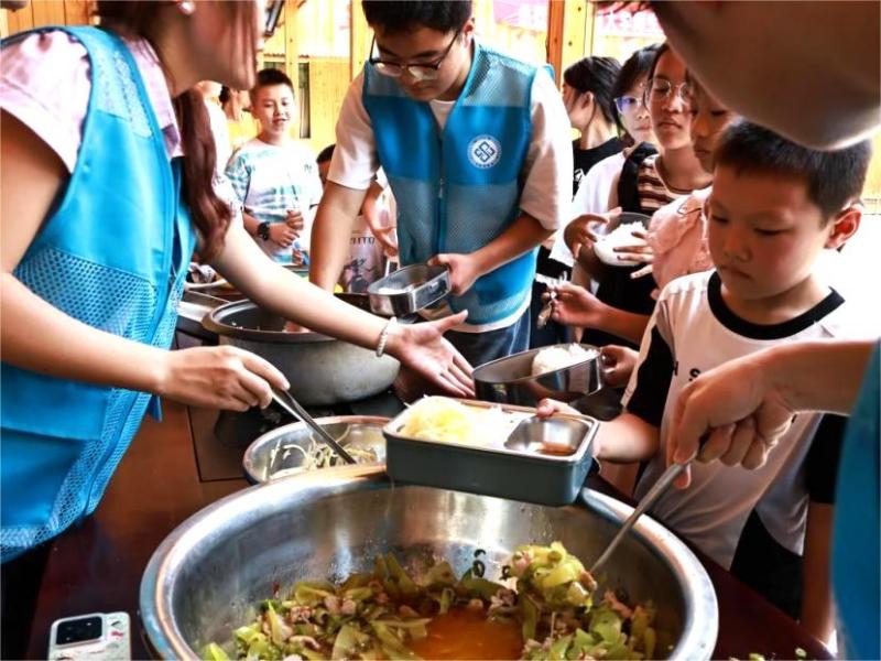 四、午餐時刻:師生共度溫馨“食”光中午12點,廚房早已飄出飯菜的香味,支教老師們一一到崗,為孩子們盛上熱騰騰的飯菜。