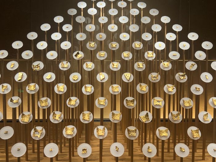 金幣窖藏展區的玻璃展柜內,500余枚戰國“郢爰”金版整齊排列,金黃的光澤在冷光燈下流轉。7月17日上午,小分隊在這里聽講解員講述1986年壽縣西門內窖藏出土的故事:“當時一鋤頭下去,泥土里滾出的金版上,‘郢爰’二字的篆刻還帶著鑄造時的火氣。”他們注意到,部分金版邊緣有明顯的切割痕跡,“就像現在用零錢找贖一樣,那時的人會把整版金幣切成小塊交易。”