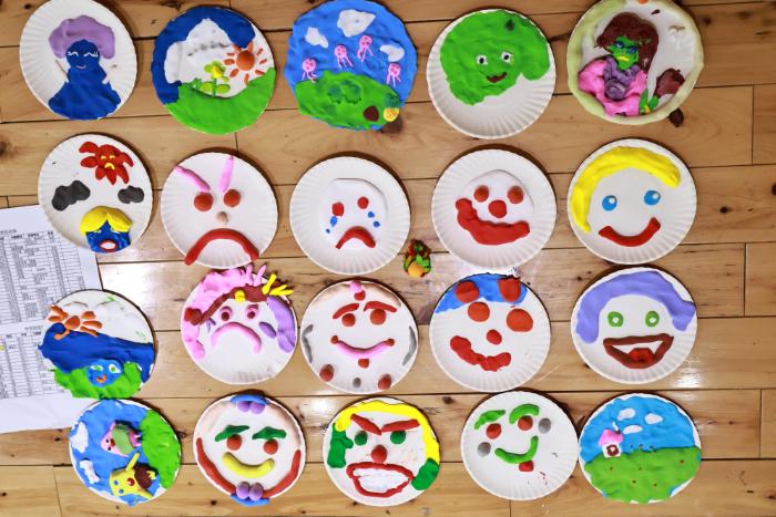 接下來,兩位老師拿出了粘土和紙盤。“你們知道嗎?情緒也能被看見。”老師啟發孩子們用粘土“畫”出情緒。“生氣可以用紅色的粘土來表達,開心則可以是明亮的黃色……”她們輕輕按壓粘土,一張大大的笑臉浮現在紙盤上。