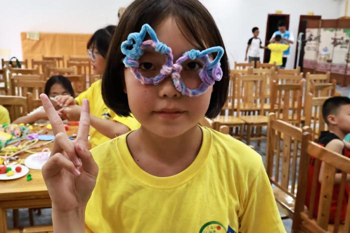 “今天,我們要用扭扭棒做眼鏡。”課堂伊始,兩位老師舉起五顏六色的扭扭棒,瞬間點燃了孩子們的好奇心。她們拿著扭扭棒給大家分步演示:先用幾根扭扭棒塑形,再繞一繞加固鏡框。在兩位老師的手里,扭扭棒仿佛有了生命,不一會兒一個漂亮俏皮的眼鏡就出現在大家眼前。