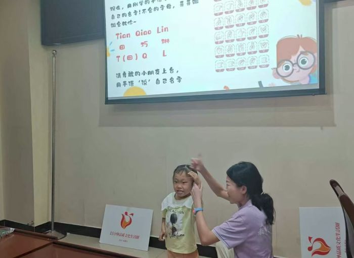 在手語課堂上,聽障大學(xué)生們展現(xiàn)出極大的耐心。他們一步一步地示范,教小朋友們用手語表達(dá)簡單的日常用語。小朋友們的眼神專注,小嘴巴跟著無聲的動(dòng)作輕輕翕動(dòng),努力模仿著每一個(gè)手勢。當(dāng)小朋友們成功用手語比劃出“你好”“謝謝”時(shí),臉上露出了燦爛的笑容,現(xiàn)場滿是溫馨與感動(dòng)。