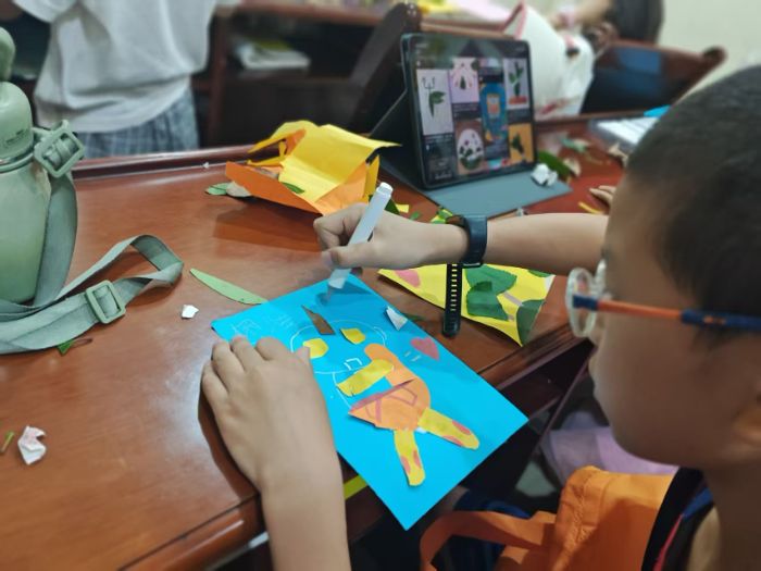自然拼貼畫課則讓小朋友們走進(jìn)自然,收集樹葉、花朵、樹枝等素材。在大學(xué)生們的幫助下,小朋友們將這些自然元素拼貼成一幅幅美麗的畫作。小朋友們充分發(fā)揮想象力,用樹葉拼出小魚、花朵,用樹枝搭建小房子。他們在創(chuàng)作中親近自然、感受自然之美,同時(shí)也鍛煉了自己的動(dòng)手能力和創(chuàng)造力。