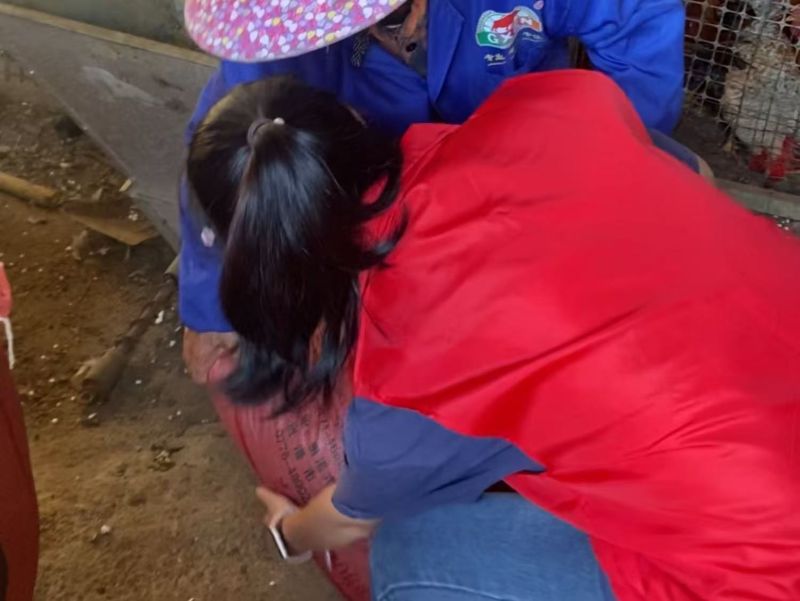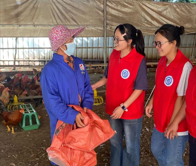 緊接著,在準備投喂的時刻,隊員們主動圍攏過來,協助養殖人員開啟裝滿飼料的紅色編織袋。大家專注看著養殖人員演示開袋、取料的動作,認真學習投喂的技巧 。隨著飼料被灑出,雞群紛紛靠近,隊員們臉上浮現出笑意,也切實體會到養殖工作日復一日的辛勞與養殖戶默默的堅守。這次親身實踐,讓隊員們更深刻領悟 “實干興農” 的內涵,紛紛表態要將專業所學融入鄉土發展實際,以行動助力鄉村振興。