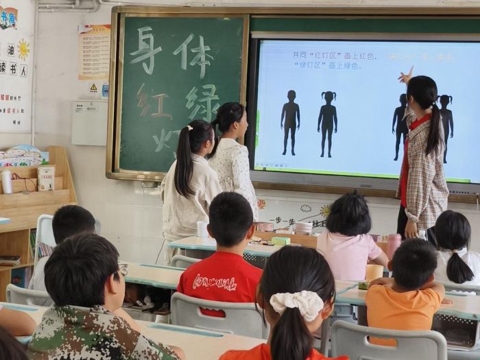 在“圈出我的紅綠燈”活動中,學生們在人體簡筆畫上用紅、黃、綠三色標記對應區域,現場正確率達98%,有效強化了對身體邊界的認知。