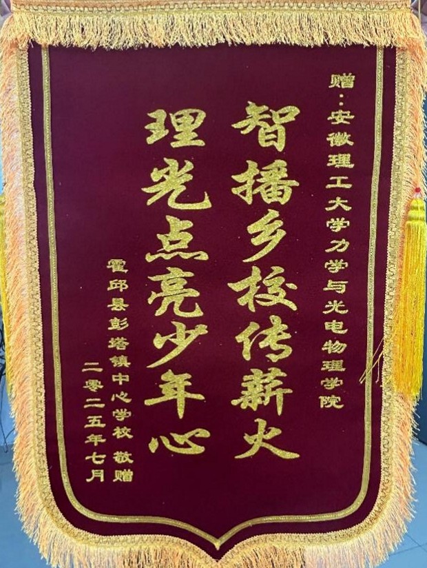 鄉村振興,教育當先。2025年7月20日至25日,安徽理工大學力學與光電物理學院“力行”鄉村振興實踐團走進安徽省六安市霍邱縣彭塔鎮中心學校,以暑期托管服務與實地調研為載體,將高校智力資源注入鄉村教育脈絡,踐行青年擔當。活動獲校方贈予“智播鄉校傳薪火,理光點亮少年心”錦旗,彰顯實踐育人實效。