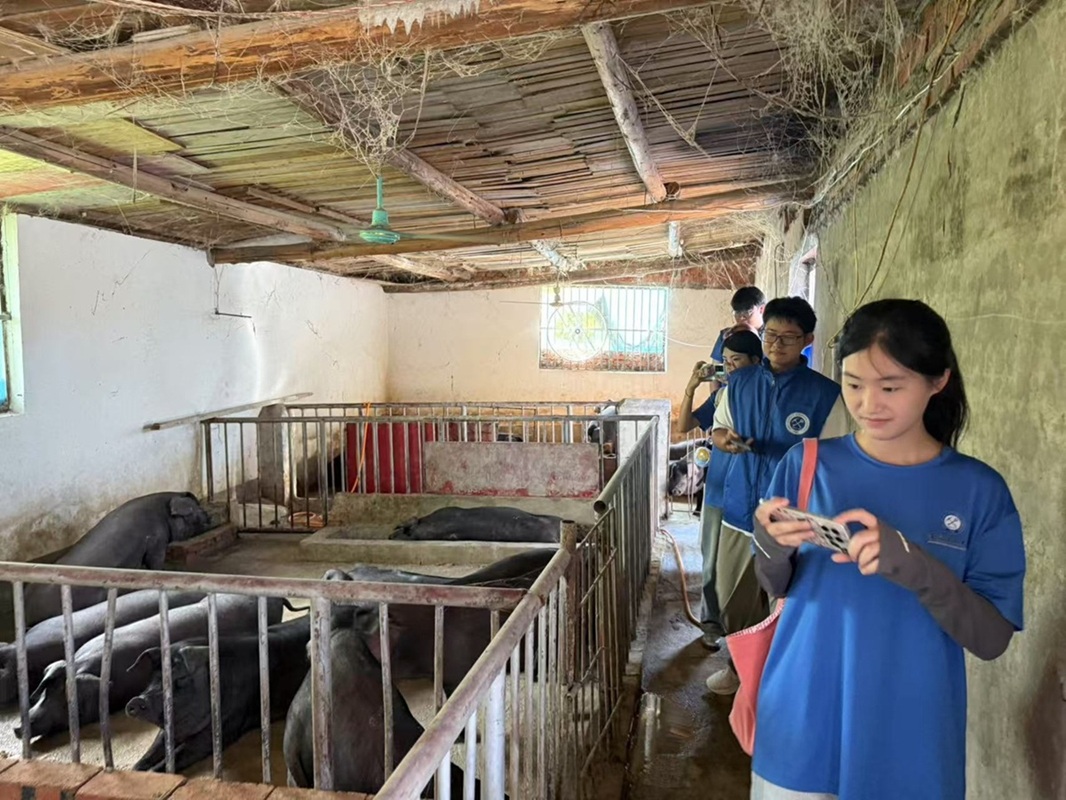 7月21日,實踐團成員在彭塔鎮中心學校開啟“研學之旅”。在黑毛豬養殖基地,“餐廚垃圾循環養殖”模式令成員深受啟發——該校將剩食轉化為飼料,既解決垃圾處理難題,又開辟了動物觀察實踐平臺。移步20畝勞動實驗田,師生同耕共采。中心校李軍修書記介紹,這種“種養結合、知行合一”的實踐,是鄉村學校勞動教育的生動探索。“這些扎根鄉土的勞動課,是城市難復制的育人智慧!”師生感慨道。