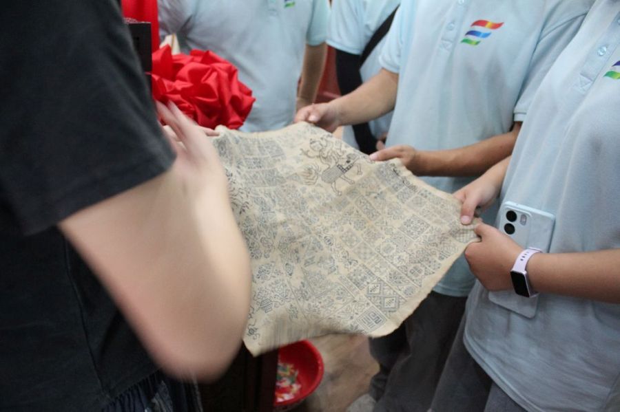 “這花母子,是無數繡娘傳下來的活檔案。”非遺傳承人姚江蓮女士將一卷泛黃的絹布在實踐團成員面前緩緩鋪開,輕聲介紹。作為嫁花的圖樣模板,絹布上的花鳥、鴛鴦、吉祥結等紋樣,每一處細節都凝結著歲月的打磨,牡丹花瓣的弧度必貼合自然肌理,喜鵲尾羽的層次需顯靈動之姿,就連葉片的脈絡走向,都兼顧著審美意趣與吉祥寓意。