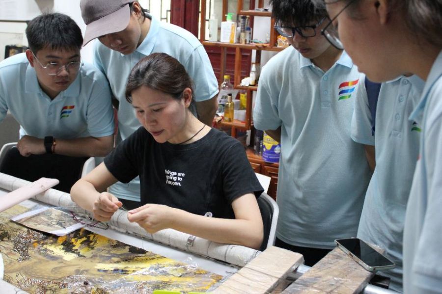 圖為實踐團成員觀賞繡制嫁花過程。彭藝攝