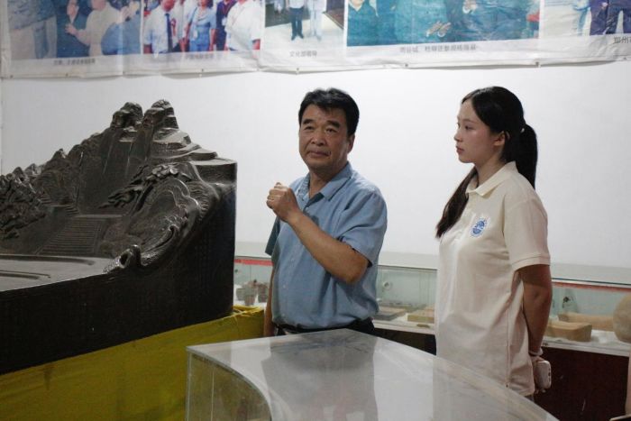 圖為界首存世博物館工作人員為實踐團成員介紹張存世作品。張子欣 攝