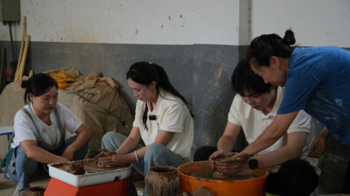 探訪期間,在邢淑芹、邢會的指導下,團隊成員們親身體驗了彩陶泥塑的揉、捏、拉坯技巧,以及雕花時“以刀代筆”的精細手法。他們深刻體會到“三分塑,七分刻”的工藝精髓,每一次下刀都需精準無誤,方能雕琢出栩栩如生的圖案。