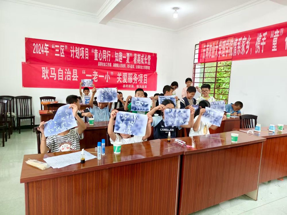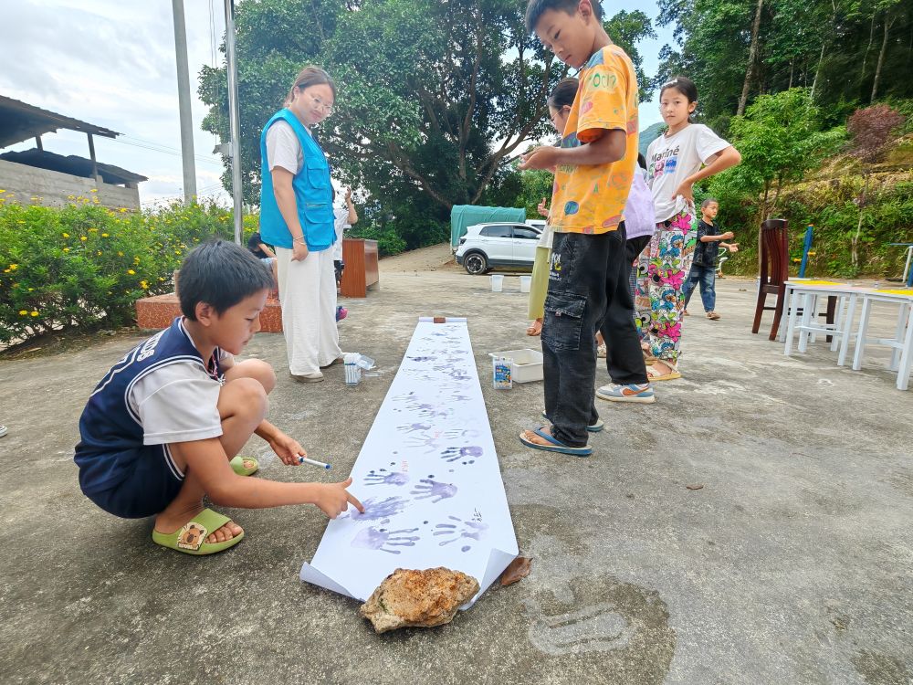 結營儀式那天,云南農大學子們特意準備了長長的白紙。當孩子們蘸著碘伏按下藍色手印時,小小的掌印與云南農大學子們的大手印緊緊挨在一起,像一串糖葫蘆,串起了七天的點點滴滴。“這是我們的‘攜手印時光’,不管以后走多遠,看到這張紙就會想起班必村的夏天。”金冬梅說。