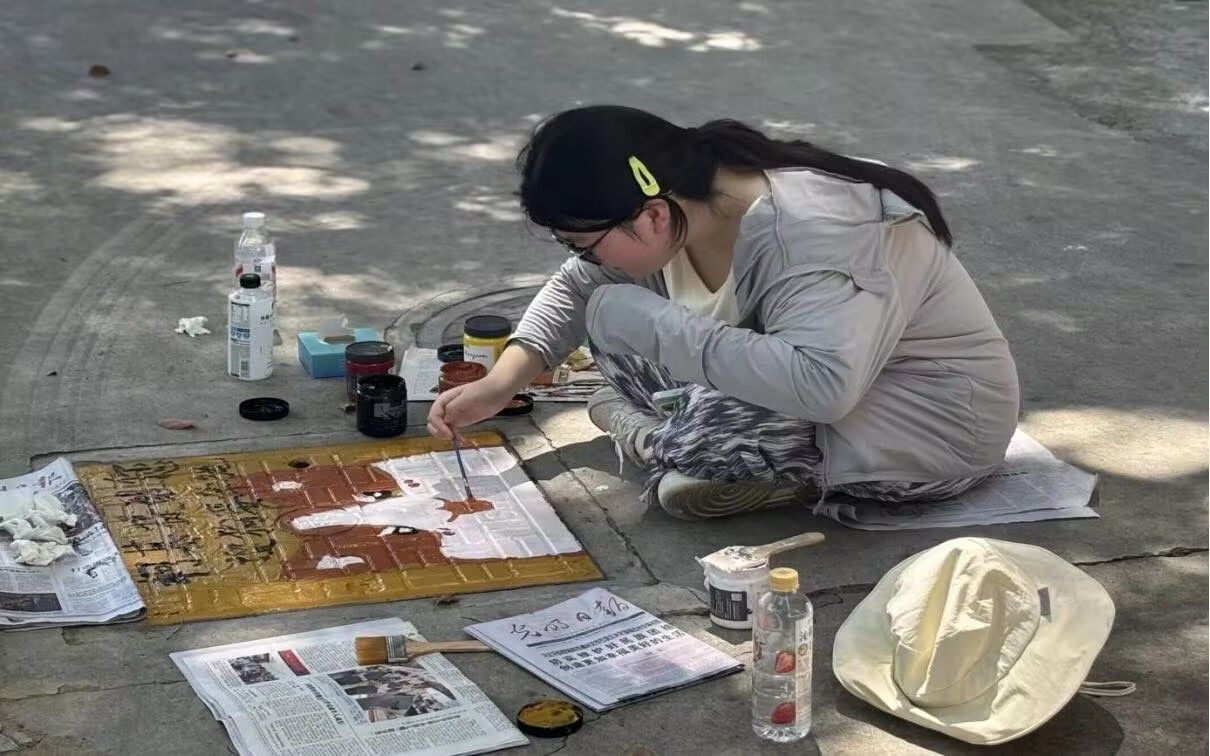 擦拭、打底、上色……看似簡單的步驟,卻藏著細致與耐心。烈日下,志愿者們額頭上的汗珠順著臉頰滑落,滴在沾滿顏料的手上,卻沒人停下手中的活計。“你看這個井蓋位置靠近遛狗區,咱們就畫‘文明遛狗’主題吧,畫一只可愛柯基,旁邊加上文明標語,直觀又好懂。”志愿者們商量著,將簡單的元素組合成生動的場景。