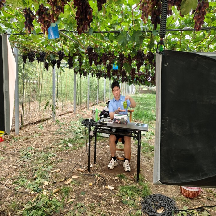 實踐團隊成員體驗直播帶貨葡萄。王浩楠攝