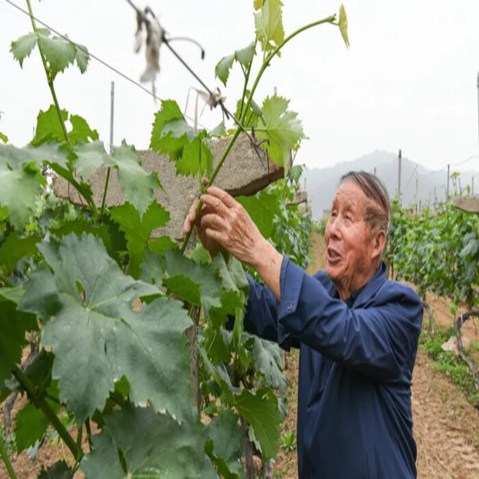 在西安市葡萄研究所的百年藤架下,實踐團隊見到了被譽為“戶太八號之父”的紀儉。老人戴著助聽器但卻依然精神矍鑠,指尖輕撫過虬結的藤蔓,身后是太平河畔綿延的試驗田。當實踐團隊問起育種初心時,他望向秦嶺群峰:“太平河亂石灘上虧掉全部積蓄那年,女兒哭著想放棄,我告訴她——石頭縫里也能長出金葡萄!”