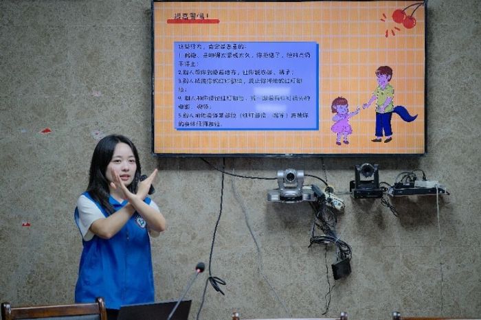 屏幕上播放的動畫短片牢牢吸引著孩子們的目光,小腦袋們隨著情節微微晃動。當實踐隊員拿出印著卡通人物的身體卡片時,活動室里泛起一陣微妙的安靜。“這里!這里是不是?”羅皓俊突然漲紅了臉頰,指著卡片上穿小背心的位置急切發問,語氣里帶著幾分不好意思的“莽撞”。這聲提問恰恰揭開了孩子們心底對知識的渴求與懵懂。隊員們抓住這個“痛點”,用童趣化的語言細致講解,坦然又耐心。孩子們紛紛圍攏過來,七嘴八舌地拋出疑問,那些曾經羞于啟齒或無人解答的困惑,在這個燥熱的午后被陽光徹底曬透,化作清晰的認知沉淀在心底。