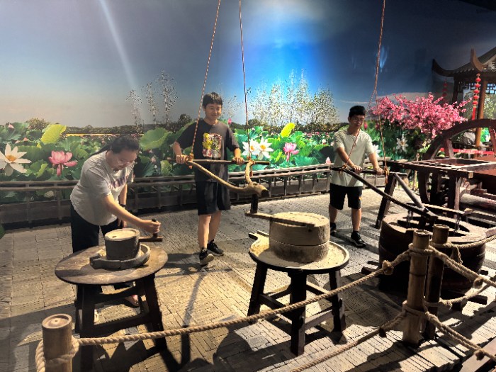 圖為團隊成員體驗如皋當地農耕文化中重要的研磨工具石磨根據不同功能演化出的不同種類。(多彩大學生網通訊員 張升鶴攝)
