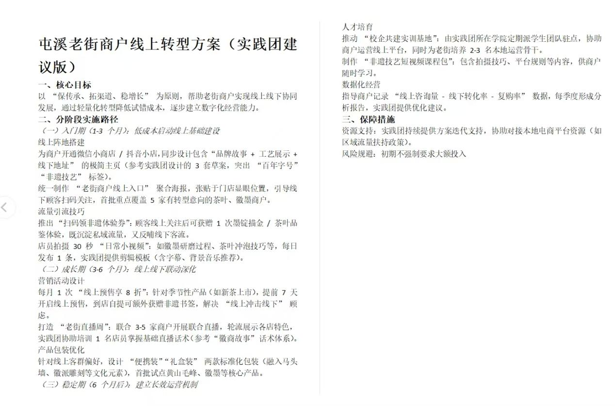 7月28日,團隊調研屯溪老街發現,僅3家老字號商戶擁有直播間,67%商戶因缺乏運營人才、擔心線上沖擊線下而對轉型持觀望。團隊隨即策劃“掃碼領非遺體驗券”、“線上預售享8折”等聯動活動,設計3套融入“徽商故事”的電商主頁方案,并提交《屯溪老街電商發展建議報告》,提出“校企共建運營實訓基地”等5項建議。