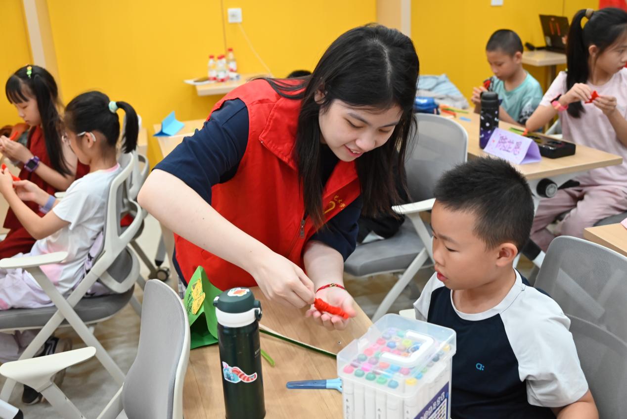 在美育培養方面,隊員們精心設計了扭扭棒手工、超輕黏土、非遺漆扇等創意課程。這些課程不僅培養了孩子們的觀察分析能力,更通過色彩搭配、造型設計等環節,激發他們的藝術想象力和創造力。看著孩子們將天馬行空的想法轉化為一件件獨具匠心的手工作品,隊員們都倍感欣慰。