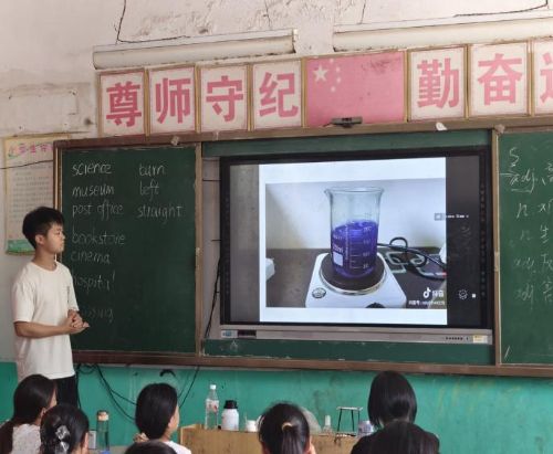 圖為支教場景,團隊成員騰老師,在教室指導(dǎo)孩子們進行科學(xué)實驗,桌上擺放燒杯、試劑、水瓶等物品,展現(xiàn)鄉(xiāng)村科學(xué)支教課堂的互動。[張鈺婧]/攝