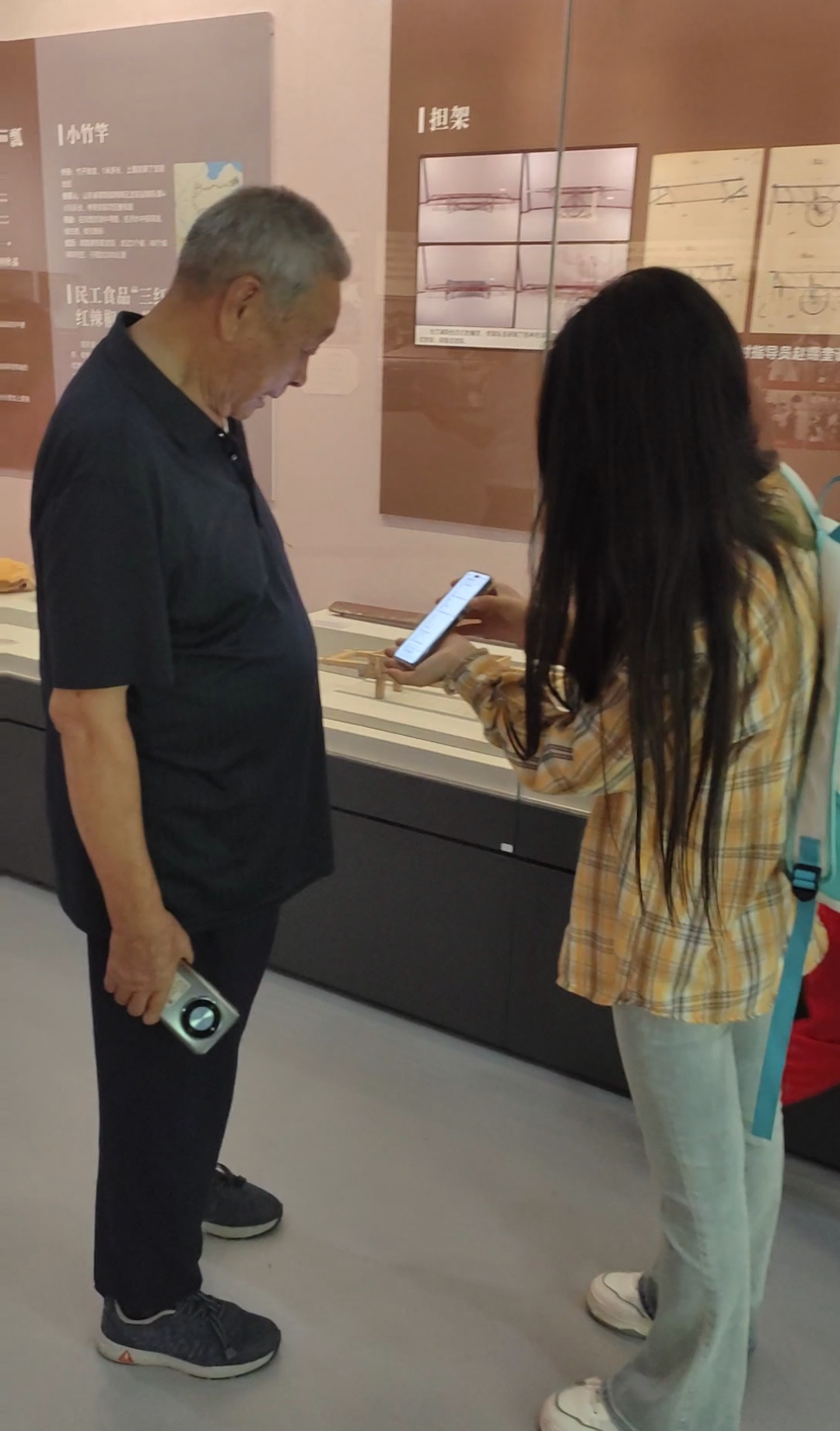 實踐過程中,小隊以客觀視角,捕捉不同參觀者與歷史對話的瞬間。在“十人橋”復原區,炮火音效與硝煙色燈光交織,蠟像還原的戰士群像震撼人心——他們弓腰頂起木板,渾濁“河水”漫過膝蓋,遠處“炮火”映出堅毅面容。此時,一位拄拐老人走入鏡頭,黑色襯衫別著褪色紀念章,目光久久停在蠟像上。小胡輕聲詢問,老人轉過身,皺紋里藏著歲月沉淀,眼神卻亮得驚人:“來看看英雄們,當年打仗苦啊,可他們沒怕過。”談及難忘之處,老人沉默幾秒,抬手抹了眼角:“是犧牲精神,現在的好日子,都是他們拿命換的,你們這些娃娃得記住。” 話語帶著哽咽,卻如重錘,砸在小隊成員心上,讓課本里“十人橋”的鉛字,真正化作鮮活的英雄群像。