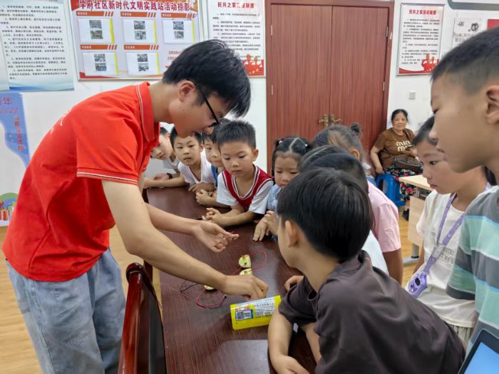 “老師,我的燈泡亮起來了!”2025年7月8日,安徽師范大學化學與材料科學學院赴蕪湖“循化工舊夢,啟時代新章”團隊走進學府社區,開展“新能源啟蒙&作業幫幫團”宣講活動。團隊成員帶著對科普的熱忱,在這里與孩子們共度了一段充滿奇思妙想的時光。