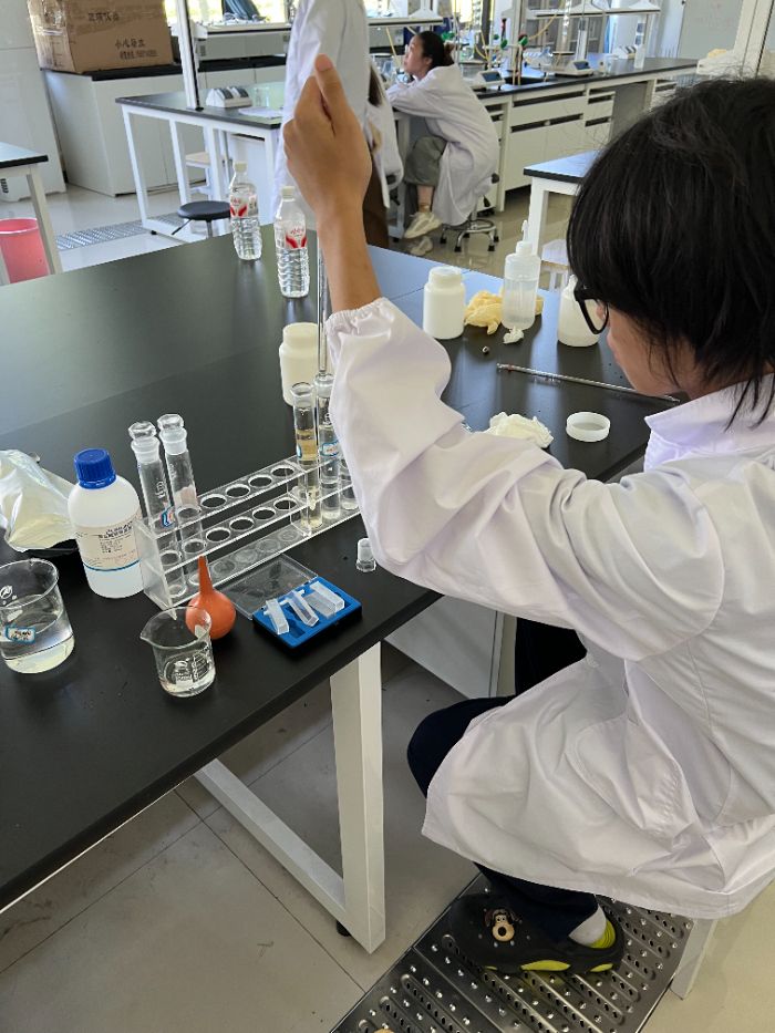 之后,實踐隊回歸校園實驗室,對采集的水樣、空氣樣品開展專業檢測。在水質檢測環節,隊員們結合大一階段化學實驗所學知識,利用前期水樣采集,有序開展水質pH與氨氮含量檢測。試劑與儀器就位,pH被精確測定,成員們捕捉水質酸堿信號、檢測氨氮解碼氮素密碼,每一步都在水環境中探索,助力直觀、客觀了解水質狀況,為水污染防控、水環境治理提供科學可靠的依據,守護水生態健康。