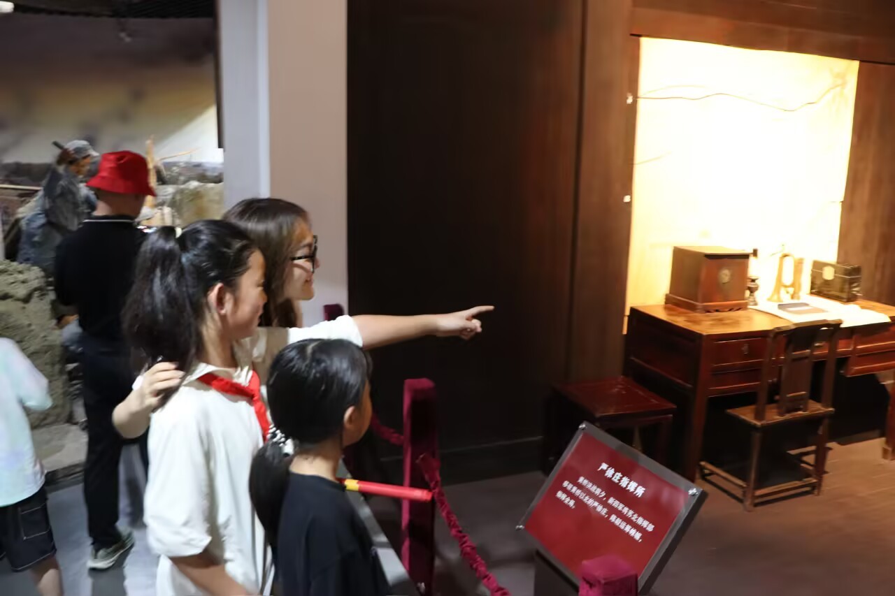 讓紅色歷史變得可知可感,助力紅色基因融入童心。7月29日至30日,“烽火黃橋,赤心傳薪”三下鄉實踐團隊宣傳組特別策劃紅色研學活動,帶領當地 20 余名小學生走進新四軍黃橋戰役紀念館。志愿者們提前備好講解素材,化身 “紅領巾講解員”,著重為孩子們講述銹跡步槍、補丁軍裝等文物背后的戰斗故事,用生動語言還原百姓支前場景。孩子們瞪大雙眼認真聆聽,指著泛黃的作戰地圖追問細節,不時舉手提問 “戰士們吃什么”“燒餅怎么送到前線”,互動熱烈。參觀結束后,大家在紀念館主題雕塑前整齊列隊,進行合影留念。