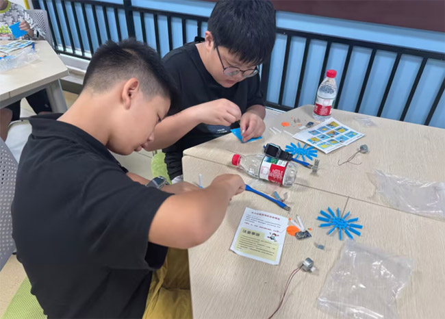 在動手實踐環節,孩子們分組協作完成水力發電模型的拼裝。當水流沖擊葉片帶動發電機運轉,小燈泡亮起的瞬間,科學原理在他們心中投下了清晰的倒影。