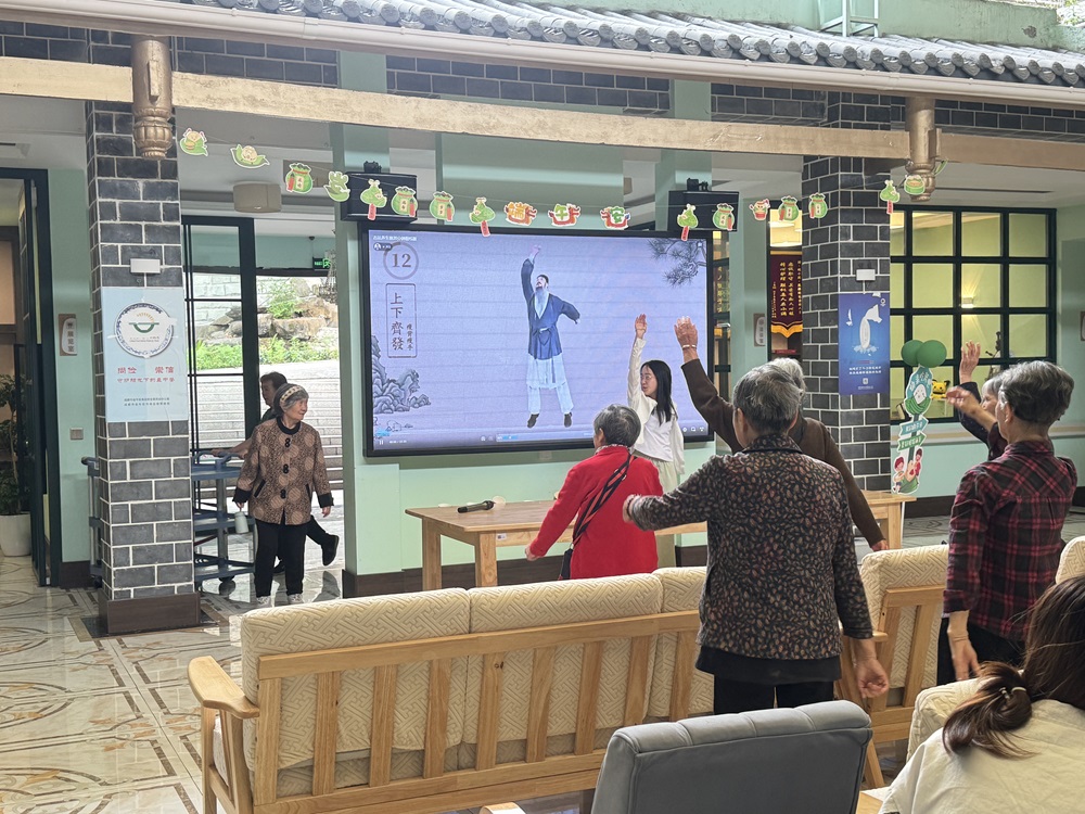 關愛老人,健康是重要的一環。活動間隙,志愿者們在大屏幕播放起“古法健身操”的視頻,并站在前方帶領。伴隨著舒緩的音樂,老人們或站或坐,認真跟著舒展手臂,活動肩頸,拍打經絡。一套動作下來,不少老人表示身體輕松了許多。一位奶奶笑著說:“這操好,做完感覺肩膀沒那么僵了。”這二十分鐘的集體鍛煉,不僅活絡了筋骨,也提振了精神。在互動中,志愿者們也時刻關注著老人身體狀態,避免身體虛弱的老人感到乏力。