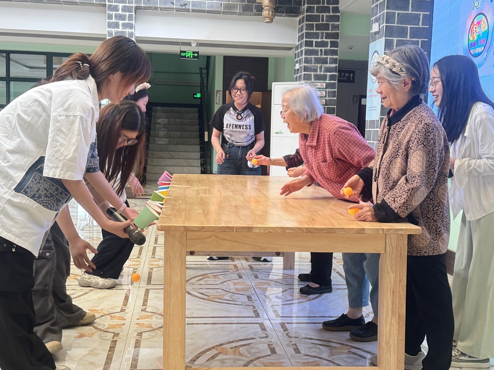 怎樣讓青春與銀發不光實現交流還可以實現交融呢?志愿者們用一張長桌、幾個紙杯和一些小球調動起了老人們的青春活力。在實踐現場,我們開展了一個有趣的推球游戲,實行推球數量排行榜,并給表現積極的老人們都發放了小獎品。游戲過程中,老人們全情投入。李奶奶俯身前傾,鎖定遠處目標紙杯,果斷發力推出小球。小球沿著桌面急速滑行,在眾人期待的目光中,于杯口邊緣盤旋滾動。圍觀的老人與志愿者們不約而同地屏息齊聲吶喊助威,緊張而熱烈的氛圍達到高潮。游戲進行到一半,輪到一位坐在輪椅上的爺爺,他起初一直在害羞、旁觀,在大家熱烈鼓勵下,他終于鼓起勇氣嘗試。歷經幾次推球后成功之時,全場爆發出熱烈的掌聲和歡呼,爺爺臉上也露出靦腆而燦爛的笑容。這場推球游戲,不僅是一場趣味競技,更成為青春與銀發之間情感交融的生動寫照。