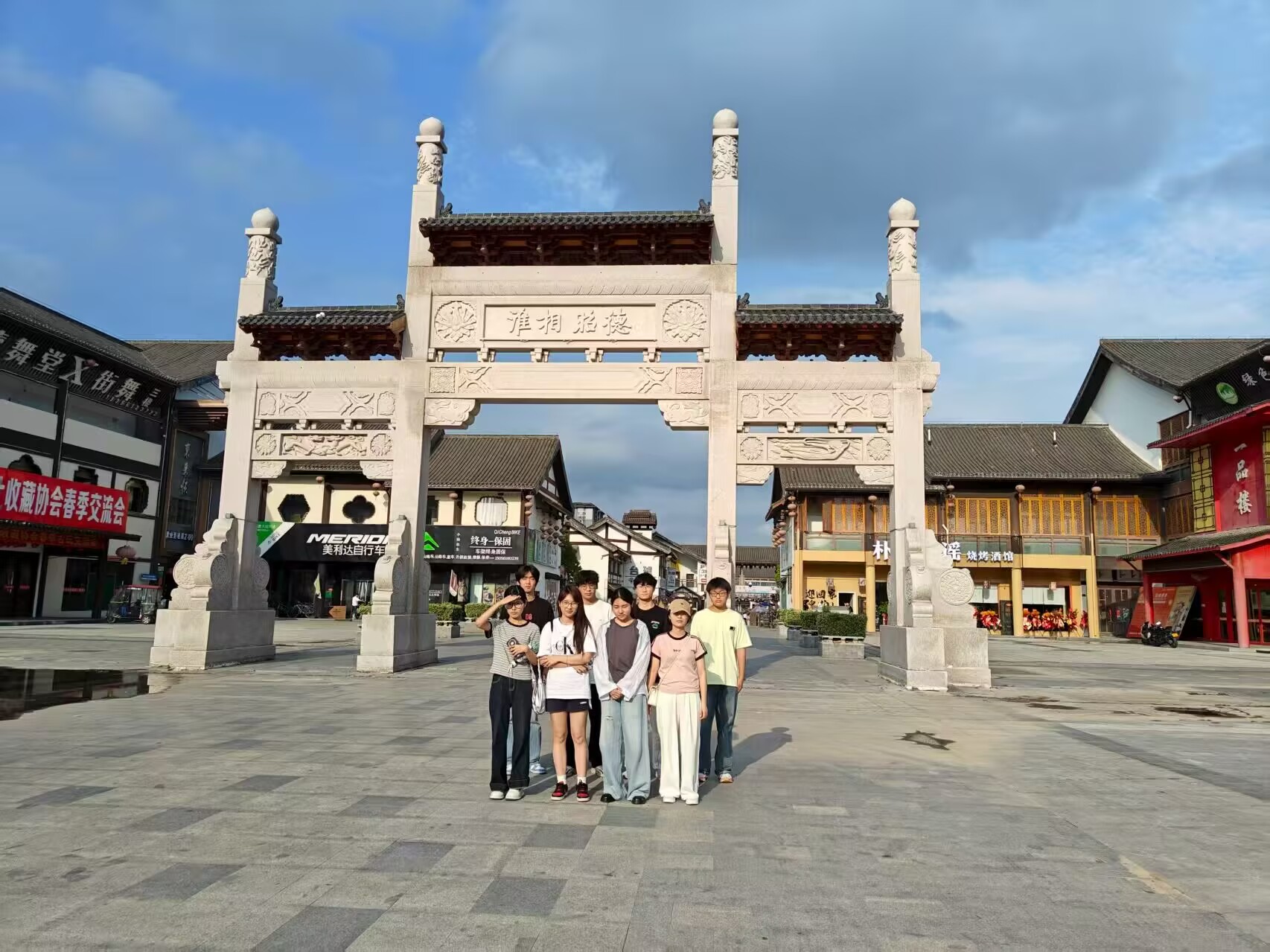 實踐尾聲,團隊于**“淮湘昭德”石牌坊** 下定格合影。牌坊通體石砌,刻工精細,“淮湘昭德”四字剛勁,浮雕“漕運圖”“商船往來”再現運河盛景。藍天為幕,古建為憑,隊員們的身影與歷史遺存重疊,成為運河文化傳承的青春注腳。