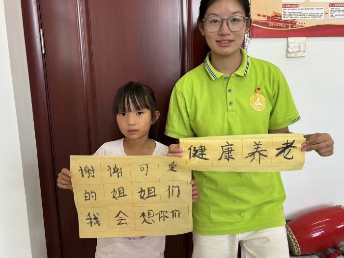 服務隊從文化與安全兩方面發力,為孩子們的長遠成長播撒“金種子”。書法課上,孩子們握筆的小手雖抖,眼神卻專注,墨汁在宣紙上暈開時,漢字的橫平豎直悄悄住進心里;防溺水、防中暑等安全課則結合實際場景,用模擬演示、問答互動等方式糾正認知誤區,讓安全意識扎根心中。觀影活動放的是勇敢者的故事,看到主角克服困難時,孩子們眼里閃著光——這些藏在墨香、叮囑和故事里的力量,正像種子一樣埋進心里,慢慢發芽。