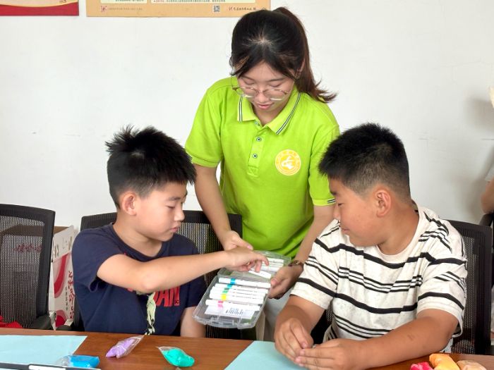 圖為志愿者為兒童分發(fā)畫(huà)筆。王亞璇 攝