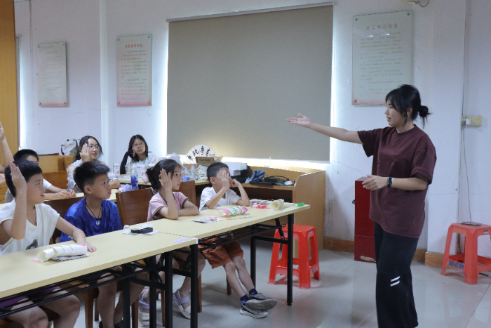 突擊隊與當地村委積極溝通,從實踐地招募32名8—13歲的學生,以夏令營的形式開展為期2天的廣府非遺教學活動,致力于探索并實踐“非遺+教學”的趣味化互動模式,以東江村為陣地,精心策劃了四門特色課程,將廣府童謠、魚燈手工、粵劇非遺、法律知識帶入基層課堂,寓教于樂,讓孩子們在輕松愉快的氛圍中觸摸廣府文化的根脈,感受傳統與現代交織的魅力。