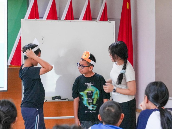 圖:支教老師向分享粵劇小游戲的規則(鄧飛翔 攝)