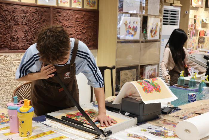 圖為傳承人向實踐隊員演示木版年畫拓印過程的場景。 張芳瑜 供圖。