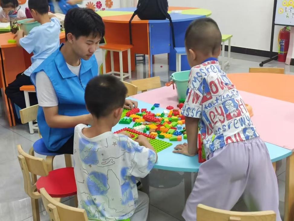 創意搭建:小朋友使用積木搭建模型,志愿者協助他們完成拼裝,共同展現了“協作”的精神。