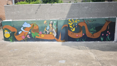7月16日起,墻繪進(jìn)入創(chuàng)作階段。美術(shù)組的兩名隊(duì)員李宣霖和高曉燕率先用粉筆勾勒輪廓,從半夏、艾草等常見(jiàn)藥草到《本草綱目》中的經(jīng)典圖譜,一步步將中醫(yī)藥文化元素轉(zhuǎn)化為生動(dòng)的視覺(jué)符號(hào)。其余隊(duì)員則分工參與描邊和丙烯上色,鮮艷的色彩在墻面上逐漸鋪展。