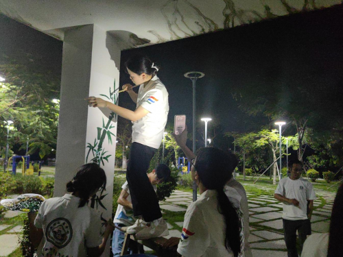 期間,團(tuán)隊(duì)面臨多重挑戰(zhàn):每日上午需參與街道其他志愿服務(wù),午后又遇臺(tái)風(fēng)將至的預(yù)警,為避免已完成的畫(huà)稿被雨水破壞,隊(duì)員們利用傍晚和夜間時(shí)間加班加點(diǎn)。“晚上光線(xiàn)不足,我們就舉著手電筒照亮墻面,輪流接力繪畫(huà)。”隊(duì)長(zhǎng)回憶道。隊(duì)員們向附近居民尋求幫助后,居民主動(dòng)為隊(duì)員們懸掛臨時(shí)照明燈,還搬來(lái)椅子方便大家繪制高處圖案。“這些大學(xué)生為我們村做實(shí)事,我們搭把手是應(yīng)該的。”居民阿叔說(shuō)道。